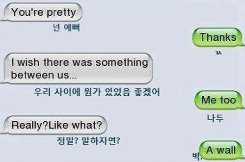 메시지 내용을 보면 먼저 말을 건 사람이 “예쁘다”고 칭찬을 한다. 그러자 상대는 고맙다는 짧은 답변으로 끝낸다. 이어 “우리 사이에 뭔가 있었으면 좋겠어”라고 다시 대화를 이어가려 하자 ‘나도’라고 답한다. 그 말에 한껏 들뜬 고백자가 “예를 들자면 어떤?”이라고 묻자 상대는“벽”이라고 답해 대화를 더이상 할 수 없게 차단해 버린다.