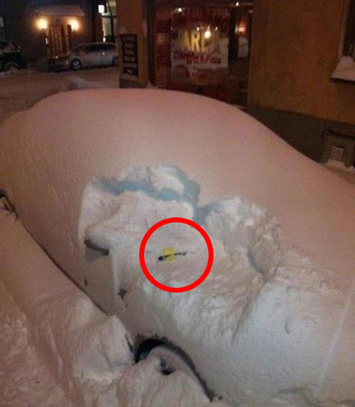 자동차 한대가 폭설로 눈에 뒤덮여 있는 모습이다. 그런데 자동차 앞 유리 한켠만 눈이 치워져 있는 것이 보인다. 자세히 보면 와이퍼 아래 주차 위반 티켓이 끼워져 있다.