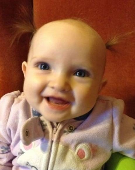 공개된 사진 속에서 아기는 몇 가닥 되지 않는 머리를 양 갈래로 묶은 채 해맑은 미소를 짓고 있다. 아기의 헤어스타일은 마치 애니메이션 영화의 주인공 ‘슈렉’을 연상케 해 미소를 짓게 했다.