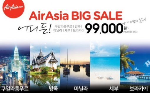 에어아시아는 “2일 오전 1시(한국시각)부터 오는 8일까지 말레이시아 태국 필리핀 등지로 가는 편도 항공권을 최저 9만 9000원에 선착순 판매한다”는 공지를 알렸다.