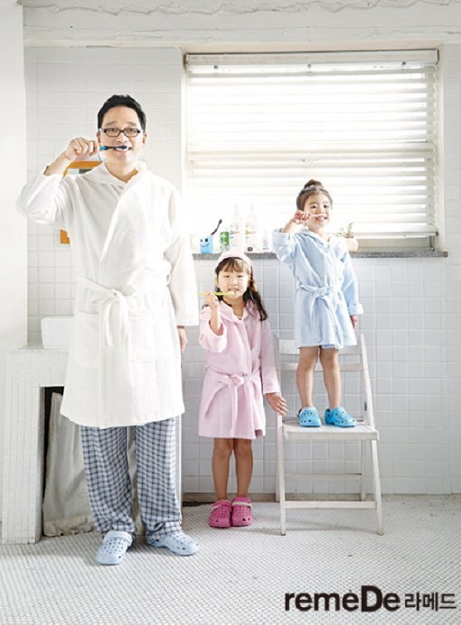 EDITOR 곽은영 PHOTOGRAPHER 권오경 COOPERATION 유한양행, 김영삼 레옹치과 원장 김영삼 원장은 2001년 치과대학 예방치과수련의 시절 우연히 공모한 개그맨 시험에 덜컥 합격해 방송국과 치과를 오가며 일을 한 이색적인 이력을 가지고 있다. 당시 이러한 독특한 이력은 그의 개그캐릭터에 반영돼 ‘안다 박사 김박사’로 한창 인기몰이를 하기도 했다. 그러나 2007년, 건강상의 이유로 모든 방송활동을 중단하고 미국으로 떠난 그는 1년 후 귀국해서는 치과의사 일에만 집중했다. 중앙대학교, 부산대학교, 전북대학교 등에서 외래 교수를 역임하고 <안다박사의 알기 쉬운 치과 치료>, <치아건강보험의 달인되기> 등 9여 권의 치의학 관련 서적을 집필한 그가 최근에는 예방관리 전문 치과의사로서 활동을 시작했다. “구강 건강에서 가장 중요한 것은 주기적인 치과 방문과 홈 케어를 통해 질환을 예방하는 것”이라고 말하는 그는 두 딸에게 좋은 추억을 만들어주고 싶어 이 자리에 참석하게 됐다고 말했다. 그의 두 딸인 김이시수(7세)와 김이니수(5세)는 각각 아빠를 쏙 빼닮은 외모와 끼를 선보이며 촬영 내내 화기애애한 분위기를 연출했다. 치과의사인 아빠는 어떻게 아이의 치아건강을 지켜주고 있을까? 부모가 직접 지도하는 ‘유한 투디스 키즈 진심칫솔’ 치과의사이지만 일에 치이다 보니 아이들의 양치습관을 생각만큼 자주 체크하지는 못한다고 말하는 김영삼 원장은 오히려 이 시간을 통해 유아기 칫솔질의 소중함에 대해 알게 될 것 같다고 말했다. 이날 김영삼 원장이 유아기 치아건강을 위해 선택한 칫솔은 유한양행의 ‘유한 투디스 키즈 진심칫솔’. 유한 투디스 키즈 진심칫솔은 유한양행과 대한치과위생사협회 자문교수진이 어린이의 이에 딱 맞는 칫솔을 찾기 위해 치의학적으로 연구한 끝에 만든 제품으로, 부모 지도용 칫솔이 패키지로 함께 구성돼 있다. 김영삼 원장은 이 부모 지도용 칫솔로 직접 시수와 니수에게 올바른 칫솔질을 알려줬다. 보통 아이의 이를 닦아줄 때 부모가 아이의 정면에 서는 경우가 많은데, 이는 잘못된 방법이라고 한다. 아이를 부모의 무릎을 베고 눕게 하거나 부모가 아이의 뒤쪽에 서서 아이의 어금니 안쪽까지 시선을 확보한 후 치아 사이사이의 찌꺼기를 제거해주는 것이 핵심이다. “유아기 아이들에게는 칫솔질 방법을 알려주는 것만큼이나 칫솔질에 대한 흥미를 가질 수 있게 해주는 것이 중요합니다. 처음에는 강압적으로 방법에 대해서 가르치려 하지 말고 부모와 아이가 함께 칫솔질하는 시간을 가져보세요.”