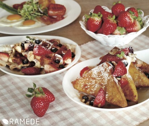 특히 생딸기에 캐러멜 시럽과 75도수의 술을 뿌려 강한 불로 달군 프랑스식 조리법의 딸기 플람베의 경우, 따뜻한 캐러멜시럽과 딸기즙의 조화가 매력인 시그니처 요리로 꼭 맛봐야 하는 메뉴다. 가격은 1인 4만 5,000원(봉사료 및 세금 포함)이며, 토요일과 일요일 2부제로 운영된다(~4/24).