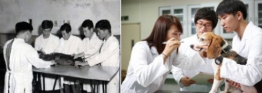 수의학 실험 실습 사진도 있다. 왼쪽 사진은 대한늬우스용으로 제공됐을 법하고, 오른쪽 사진은 건국대 수의대의 공식 홍보 사진이다.