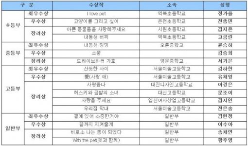또 고등부 최우상은 서울미술고등학교 김하현 학생의 작품 ‘산뜻한 사이’가, 중등부와 초등부 최우수상은 각각 오륜중학교 윤승하 학생의 ‘내동생 밍밍’과 역북초등학교 정가을 학생의 ‘I love pet’이 수상했다.