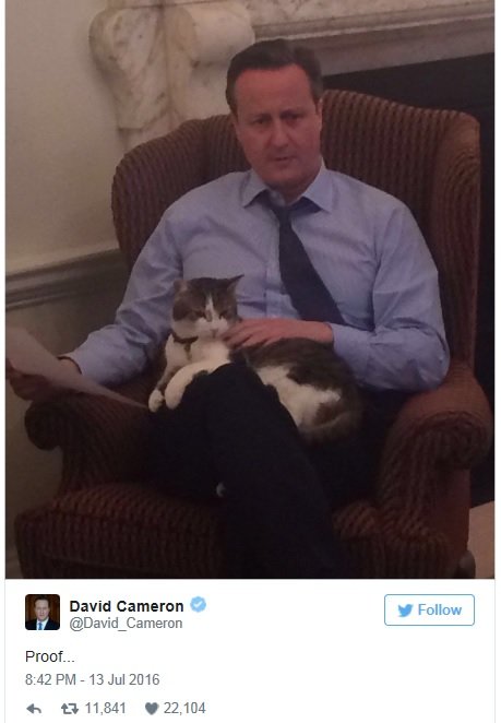 전 총리는 “나는 래리를 사랑하고, 그것을 증명할 사진 증거를 갖고 있다”며 사진 인쇄물을 내보였다. 캐머런 전 총리가 소파에 앉아, 래리를 무릎 위에 올려놓은 사진으로, 이 사진을 “증거”란 멘션과 함께 트위터에 올리기도 했다. 의원들은 박장대소했다.
