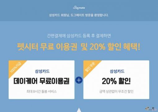 이벤트 기간 동안 도그메이트의 이벤트(https://www.dogmate.co.kr/promotion/samsung-card)에서 삼성카드를 간편결제 시스템으로 등록하면 20%의 할인권과 데이케어 1일 이용권을 무료로 받아 사용할 수 있다.