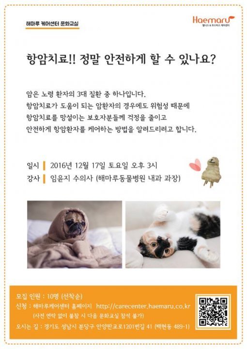 국내 최초 반려동물 호스피스 해마루케어센터에서 오는 17일 12월 문화교실을 개최한다.