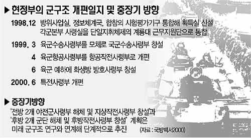 신속한 작전지휘와 전투능력 제고, 인력감축 및 예산절감 등을 위해 99년 12월까지 육군 1, 3군사령부를 하나로 통합하겠다는 것. 천 장관은 당시 장성급 20여명 등 장교 500여명을 감축해 수천억원의 예산절감 효과를 거둘 수 있다고 발표했었다.
