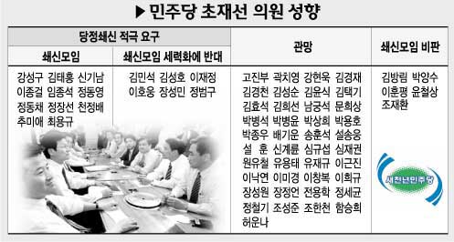 ▽쇄신모임〓5일 모임을 가진 초재선 의원들은 ‘쇄신모임’(가칭)이라는 이름으로 지속적인 목소리를 내겠다고 밝히고 있다. 모임 대변인인 임종석(任鍾晳) 의원은 6일 “5일 모임에는 개인사정으로 안나왔지만 송영길(宋永吉) 문석호(文錫鎬)의원 등이 참여할 것”이라며 “전체적으로 18명 정도가 될 것”이라고 말했다.