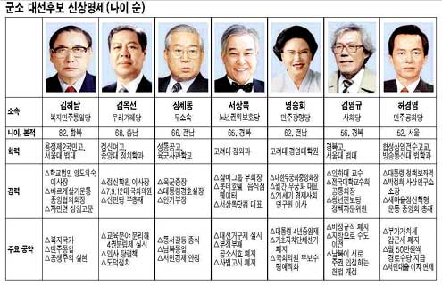 ▽김허남(金許男) 복지민주통일당 후보〓15대 국회 최고령 의원이었던 김 후보는 홍익인간 이념 실현을 표방하고 있다. 김 후보는 “엉망진창인 요즘 정치를 그냥 둬선 안 되겠다 싶어 출마하기로 했다”고 말했다. 그가 내세운 득표 기반은 자신이 총재를 맡고 있는 신라종친연합회 및 신라김씨 연합 대종원. 그는 “신라에 뿌리를 둔 200여 성(姓)의 종친을 다 합하면 3000만명에 이른다”며 “종친들만 단결하면 달리 선거운동을 할 필요도 없다”고 자신했다. 함경북도 도민회장인 그는 이산가족들의 지지도 기대하고 있다. 서울 여의도에 있는 50평짜리 당사는 종친회 사무실을 겸하고 있다.