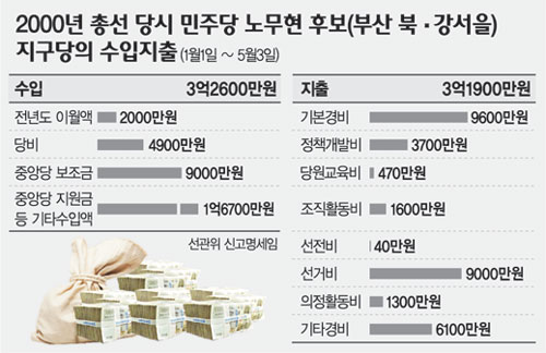 민주당 후보들이 2000년 총선을 앞둔 1월 1일부터 그해 5월 3일까지의 지구당 수입 지출 명세를 선관위에 신고한 바에 따르면 중앙당이 225개 지역구에 내려 보낸 지원금은 모두 338억4000만원으로 후보 1인당 평균 1억5000만원이었다.