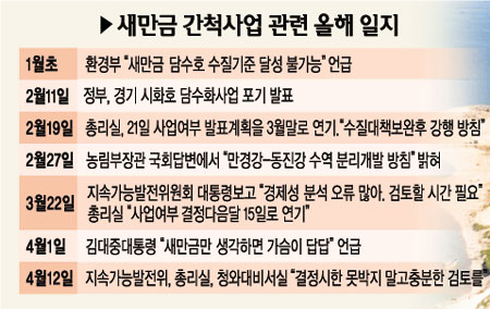 ▽민주당 입장 표명의 배경〓민주당 관계자는 “이미 건립된 방조제의 기반 토석이 바닷물에 의해 계속 유실되고 있어 결정을 마냥 미룰 수 없기 때문”이라며 “식량 안보 등의 이점에 비춰 사업 취소는 국가적 손실”이라고 설명했다. 그러나 ‘경제적 타당성’ 논란은 계속되고 있다.