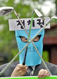그는 또 "자민련 김종필(金鍾泌) 명예총재가 일본 혼마 회장으로부터 2000만원 상당의 파이브 스타 골프세트를 받았다는 것을 자랑하는 것을 보고 서글픔을 느낀다" 며 "일본 교과서 왜곡 문제로 시끄러운데 그런 말을 해서 되겠느냐"고 개탄했다.
