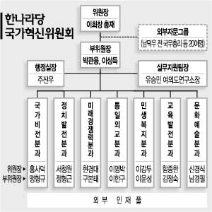 한나라당은 민주당의 공세와 관계 없이 이번주 중 국가혁신위 7개 분과위 위원장단 모임을 갖는 등 활동을 본격화할 예정이다. 한나라당은 또 늦어도 다음주 초에는 분과위마다 당 내 인사 7명과 외부 인사 3명 등 10명의 위원을 위촉하고 쟁점별로 국민 여론 수렴에 나설 계획이다. 국가혁신위 행정실장인 주진우(朱鎭旴) 의원은 “국민에게 다가가 직접 접촉해 국민 스스로 신뢰할 수 있는 비전을 제시하게 될 것”이라고 말했다.
