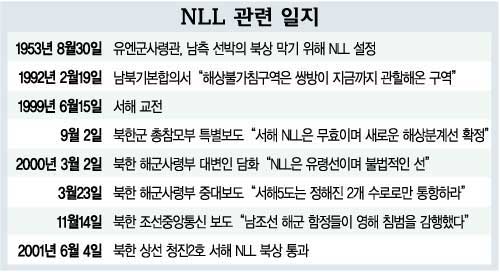 북측은 99년9월 NLL을 무시하는 ‘해상분계선’을 선포한 데 이어 지난해 3월 ‘서해 5도 통항질서’를 발표해 ‘서해 5도(백령도 대청도 소청도 연평도 우도)는 북측 수역에 속하므로 남측은 2개의 수로만을 이용해 이들 섬을 오가라’고 주장하기도 했다.