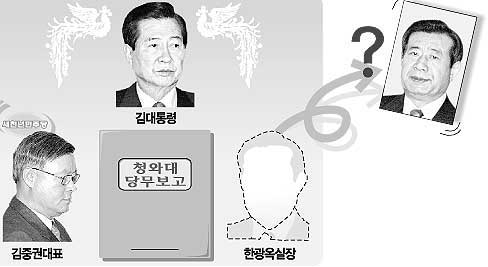 하지만 당의 요구가 받아들여질 가능성은 적어 보인다. 김 대통령은 98년 취임 이후 투명한 국정 운영을 강조하면서 당 지도부의 독대를 허용하지 않고 대표의 보고 때는 대통령비서실장을, 당4역의 보고 때는 정무수석이나 정책기획수석 등을 배석하도록 해왔기 때문이다.