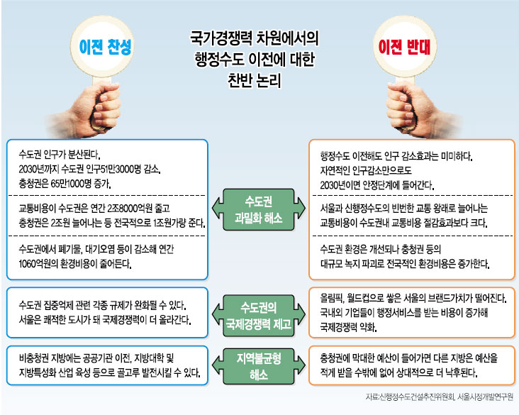 “서울과 충청권을 연결하는 거대 수도권이 생기고 여기에 자원이 집중되면 다른 지방과의 격차는 더 커진다. 정치 행정 사법 외교가 다 빠져나가면 한국의 대표 도시였던 서울의 국제적인 위상은 크게 떨어질 것이다.”(수도이전 반대측)