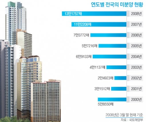 스피드뱅크 김은경 리서치팀장은 “부동산 경기가 조금만 회복되면 금세 팔릴 만한 미분양 아파트도 많다”며 “시간이 지날수록 업체들의 자금부담이 커지므로 대규모 할인 물량이 시장에 계속 나올 것”이라고 내다봤다.