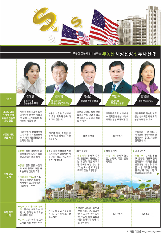 반등 시기로 박상언 대표와 김혜현 부장은 내년 하반기를, 박합수 국민은행 PB팀장은 내년 상반기를 꼽았다. 함영진 부동산써브 실장은 수도권은 내년 상반기 쯤 반등할 가능성이 있지만 지방은 침체가 장기간 지속될 것으로 내다봤다. 김기형 소장은 2010년 이후라고 답했다.