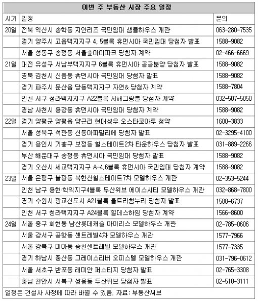 이번 주는 청약접수 1곳, 당첨자 발표 9곳, 당첨자 계약 6곳, 모델하우스 개관 7곳 등이 예정돼 있다. 부동산 침체가 장기화할 것이라는 우려가 나오면서 분양 일정을 뒤로 미루는 사업장이 늘고 있다.