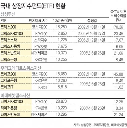 2002년 10월 이후 상장된 ETF는 모두 13개. 같은 업종 지수에 투자하는 ETF라도 운용사마다 성적이 다르기 때문에 잘 비교해서 선택하는 것이 좋다.