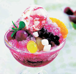 아이스크림 업체 한국하겐다즈는 포도주와 홍차 등이 함유된 신제품 4가지를 21일부터 판매한다. 포도주를 넣은 ‘와인빙수’(사진) 9500원, 홍차와 레몬을 넣은 ‘홍차빙수’ 8500원, 포도주 음료 ‘샹그리아’ 5500원, 여러 가지 과일을 넣은 ‘프렌치 아이스티’ 4500원 등이다.