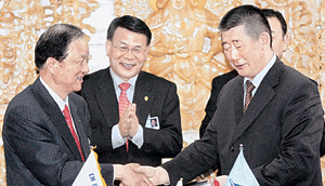 대한항공은 몽골 정부와 몽골 항공산업 발전·협력 확대를 위한 양해각서(MOU)를 8일 체결했다고 9일 밝혔다. MOU 체결식(사진)에는 이종희 대한항공 사장과 추병직 건설교통부 장관, 다그바 몽골항공청장(왼쪽부터)이 참석했다. 대한항공은 MOU 체결로 울란바토르공항의 항공 관제시설 개선 투자에 참여하게 된다.