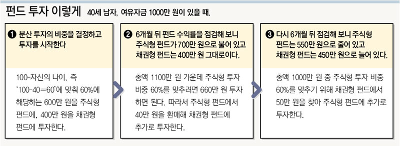 주식형펀드가 많이 불어 주식형 대 채권형 비중이 7 대 3으로 바뀌었다면 주식형에서 얼마를 찾아 채권형에 투자해 다시 6 대 4로 맞추면 된다.