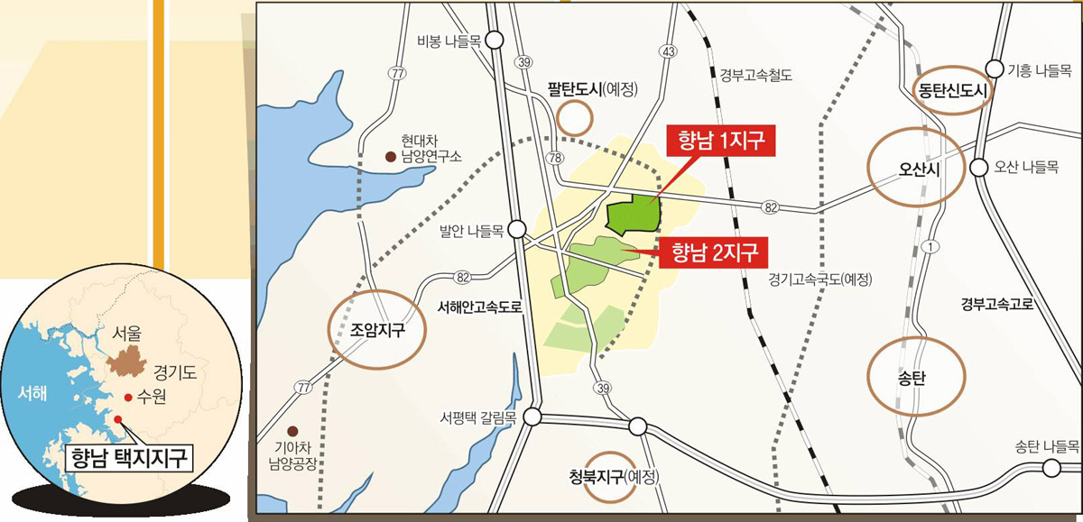 화성시 향남면 행정리, 방축리, 도이리, 평리 일대에 51만2000평 규모로 조성되는 향남택지지구에는 10개 단지 5345채가 일반 분양되며 전용면적 25.7평 이하 4102채는 전매 제한 기간이 5년이다. 25.7평 초과 1243채는 분양가 상한제가 적용되지 않지만 입주 등기 때까지는 팔 수 없다. 1개 단지 544채(한국종합건설)는 임대분양 물량이다.