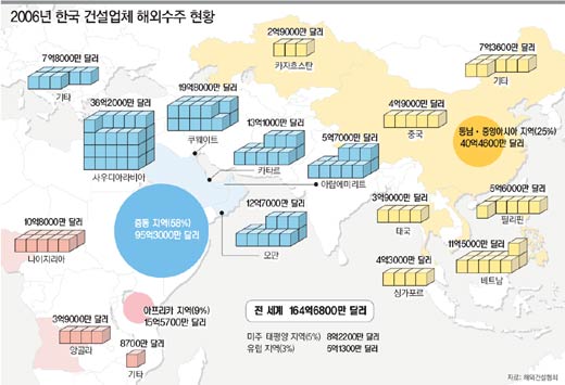 중동 지역에서 한국 건설사들이 따낸 공사 규모는 작년 한 해에만 95억3000만 달러어치로 전체 수주액의 58%를 차지했다. 석유나 천연가스 플랜트 공사가 대부분이다.