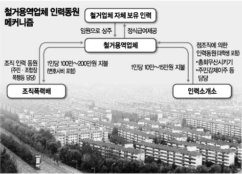 ▽철거업체의 인력동원 메커니즘〓철거업체들의 인력 동원 방법은 크게 세 가지. 자체 보유한 인력을 동원하기도 하지만 대부분은 같은 계보의 폭력배를 동원한다. 또 ‘소개소’를 통해 인력을 공급받기도 한다.