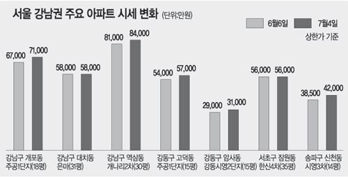 강남구 개포동 주공 1단지 18평형은 지난달 초 6억6000만∼6억7000만원에서 최근 6억9000만∼7억1000만원으로 최고 4000만원 올랐다. 역삼동 개나리 2차 30평형의 호가(呼價)도 이 기간에 2000만∼3000만원 오른 8억2000만∼8억4000만원으로 높아졌다.