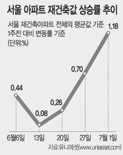 8일 부동산정보업체 ‘유니에셋’에 따르면 지난주 서울 아파트값 변동률은 0.28%로 한 주 전(0.13%)의 2배를 넘는다. 권역별로는 재건축 대상 아파트가 밀집된 강남 서초 송파구 등 이른바 강남권(0.34%)이 전체 평균을 훨씬 웃돌았다.