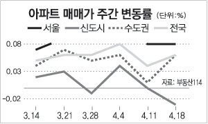 신도시는 중대형의 가격 하락이 계속되면서 0.03% 내렸다. 산본(0.18%)을 제외하고는 평촌(―0.08%) 중동(―0.06%) 분당(―0.05%) 등이 모두 떨어졌다.