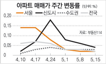 부동산 정보업체 부동산114에 따르면 지난주 서울 아파트 가격은 0.02% 올랐다. 하지만 재건축 시장은 추격 매수가 거의 없고 일반 아파트 시장도 지난달보다 한산한 모습이다. 서초(0.06%) 송파(0.04%) 노원구(0.03%) 등은 올랐고 서대문(―0.02%) 금천구(―0.02%) 등은 내렸다.