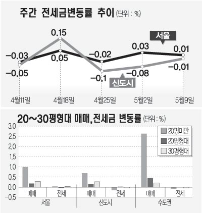 영등포구 당산동 금호베스트빌 22평형이 250만원 올라 1억1500만∼1억2500만원, 구로구 신도림동 동아1차 32평형이 250만원 떨어져 1억6000만∼1억6500만원에 거래됐다.
