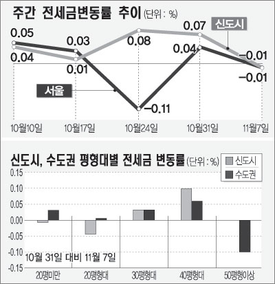 유니에셋에 따르면 지난주 수도권(―0.06%) 전세금이 연속 2주 하락세를 이어간 가운데 신도시와 서울도 약보합으로 밀려났다.
