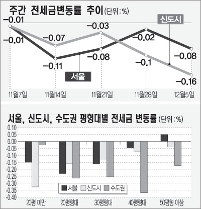 지난주 서울에서는 강남권(―0.07%), 강북권(―0.14%), 강서권(―0.15%) 등 전 지역에서 전세금이 떨어졌다.