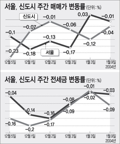 신도시 가운데는 대규모 단지들의 입주가 시작된 평촌(―0.38%)에서 많이 떨어졌고 분당(0.2%)과 일산(0.03%)은 방학철 이사수요 덕에 오름세.