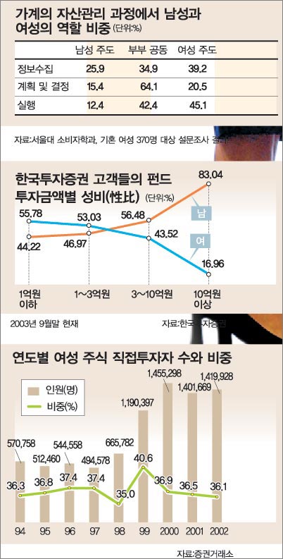 ▽여성은 자산관리의 ‘행동대원’인가=결혼한 지 8년 된 전업주부 김모씨(37)는 남편 월급 320만원에서 매달 150만원씩 적금과 보험에 붓고 있다. 어느 금융 상품을 고르는가 하는 것은 전적으로 그의 책임. 그러나 일단 목돈이 만들어지면 그는 남편에게 통장을 건넨다. 그 돈을 어디에 투자하느냐에 대한 결정은 남편의 몫이다. 그는 “남편과 종종 상의하기는 하지만 최종 결정은 남편이 내린다”면서 “어쨌든 남편이 열심히 번 돈 아니냐”고 반문했다.