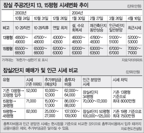 대우공인중개사무소 은희락 대표는 “매매가와 추가부담금을 합쳐도 4단지 일반분양가보다 저렴하다는 인식이 퍼지면서 2단지 아파트 값은 4월 들어 최고 5000만원 상승했다”고 밝혔다.