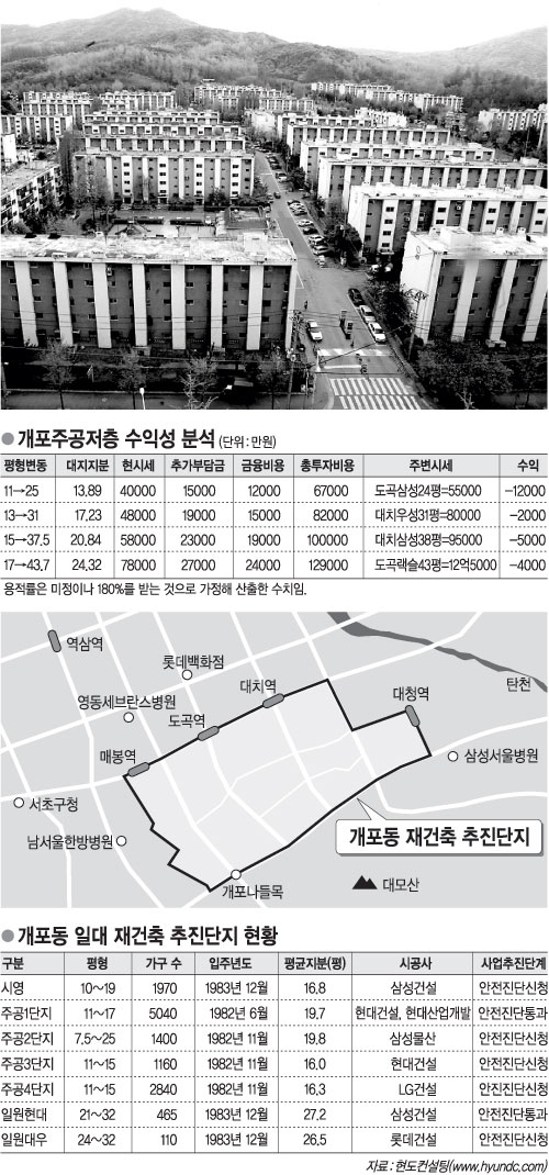 ▽용적률이 결정한다=이곳 개발의 열쇠는 ‘용적률’이 쥐고 있다고 해도 과언이 아니다. 2002년 6월 서울시에서 확정한 개포택지지구의 지구단위계획에 따르면 32개 단지의 평균 용적률을 200%로 맞추기로 했다. 그러나 저층과 고층이 혼재돼 있고 단지마다 용적률 배분에 따라 수익성이 결정적으로 차이가 나, 관할 구청은 이러지도 저러지도 못한 채 시간을 보내고 있는 상태다.
