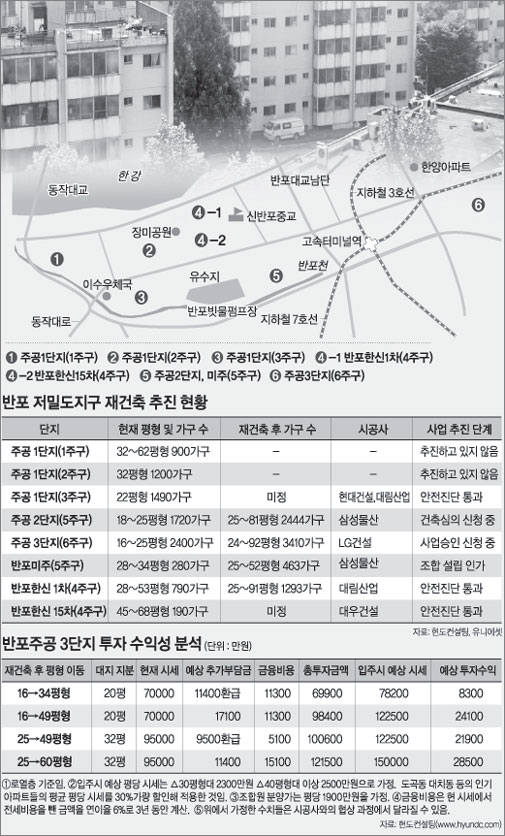 사업 단계가 가장 앞서는 곳은 지하철 7호선 반포역 근처에 있는 주공 3단지로 16, 25평형 2400가구로 구성돼 있다. 이미 사업 승인 신청을 냈으며 7월경 사업 승인이 나올 것으로 기대되고 있다. 두 번째로 사업 추진이 빠른 곳은 고속터미널에서 가까운 5주구 2단지로 현재 건축 심의를 받고 있다. 이수교차로 쪽에 위치한 3주구 1단지와 한강변에 위치한 반포한신 1, 15차는 안전진단을 통과한 상태. 1단지 1, 2주구는 재건축을 추진하지 않고 있다.