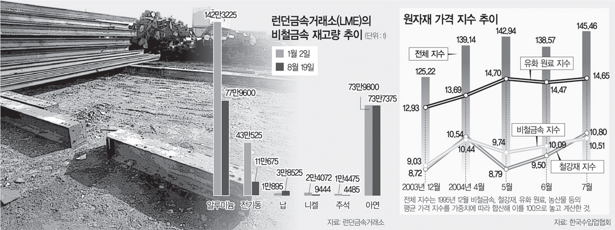 고철과 비철금속을 중심으로 원자재 가격이 다시 급등하면서 산업계에 비상이 걸렸다. 이미 일부 대기업은 순익 악화를 호소하고 있다. 사정이 더 심각한 중소기업은 물량이 없어 공장을 못 돌리는 사례도 나타나고 있다.
