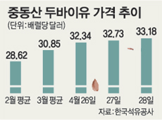 한국석유공사에 따르면 28일 거래된 중동산 두바이유는 이라크 정정(政情) 불안에 따른 공급 차질로 전날보다 0.45달러 오른 배럴당 33.18달러로 걸프전 발발 직전인 1990년 10월 16일(34.13달러) 이후 가장 높은 수준을 기록했다.
