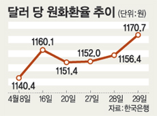 이날 서울외환시장에서 원-달러 환율은 전날보다 14.3원 오른 달러당 1170.7원에 마감했다.