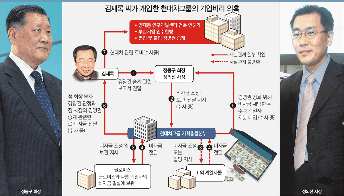 김 씨와 현대차그룹 사건이 겹치는 부분이 있다면 현대차그룹이 서울 서초구 양재동 연구개발(R&D)센터 증축 인허가와 관련해 김 씨에게 로비자금을 줬다는 것. 현대차그룹 비자금은 물론 경영권 승계와는 아무런 관련이 없는 듯했다.