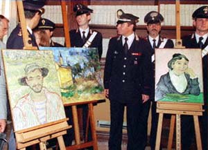| 98년 5월 로마 국립현대미술관에서 도난당했다 두 달 만에 되찾은 빈센트 반 고흐의 작품 '정원사'(왼쪽)과 '아를의 연인'(오른쪽). 가운데는 폴 세잔의 '주르당의 오두막'. |