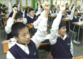 서울 강남의 한 중학교 학생들이 다음 학기 과정을 미리 배웠느냐는 질문에 앞 다퉈 손을 들고 있다. 동아일보 자료 사진