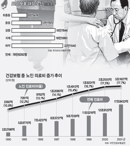 보건사회연구원 선우덕(鮮于悳) 책임연구원은 “여성의 취업이 늘고 자녀수가 줄어드는 상황에서 가족이 노인을 돌보기 힘든 데다 치매나 중풍같이 중증 질병에 걸린 노인을 가정에만 맡길 수 없으므로 국가와 사회가 책임져야 한다”고 말했다.